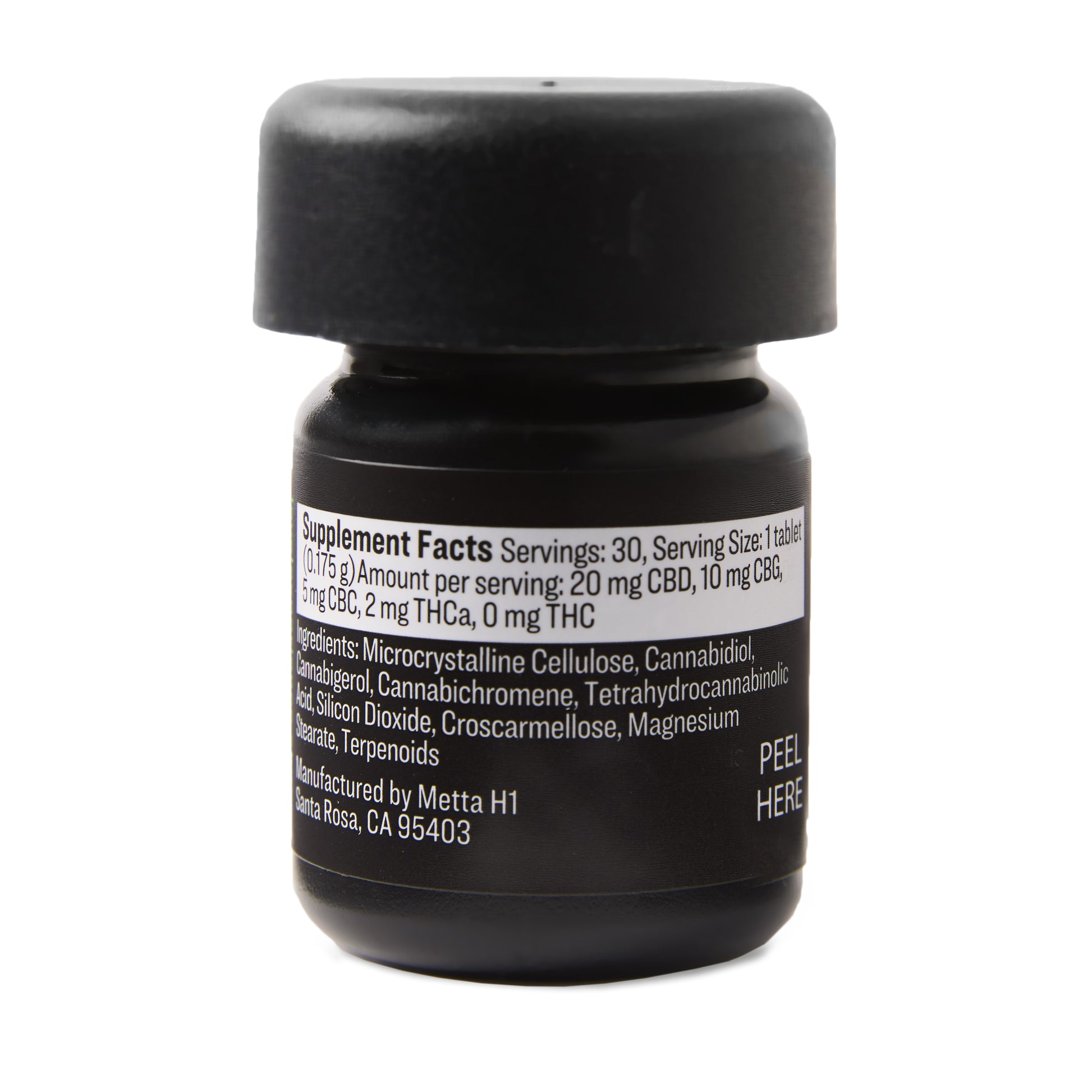 Dose: 20 mg broad-spectrum CBD, 10 mg CBG, 5 mg CBC / tablet